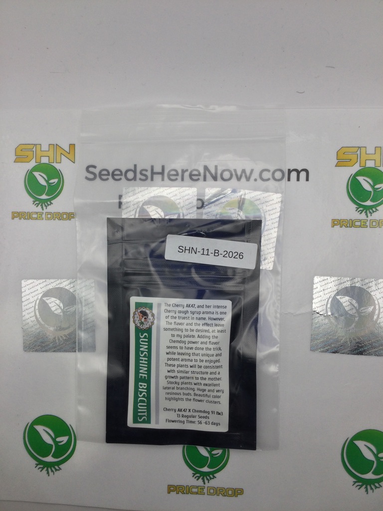 Sunshine Biscuits by Lucky Dog Seed Co. crosses Cherry AK47 with Chemdog 91 BX3. Cherry AK47 brings fruity cherry notes layered over the classic AK47 vigor, while Chemdog 91 BX3 is a backcrossed line of the legendary Chemdog 91 – one of the original chem cuts known for its sharp diesel fuel aroma. Sunshine Biscuits merges cherry sweetness with chem diesel power.