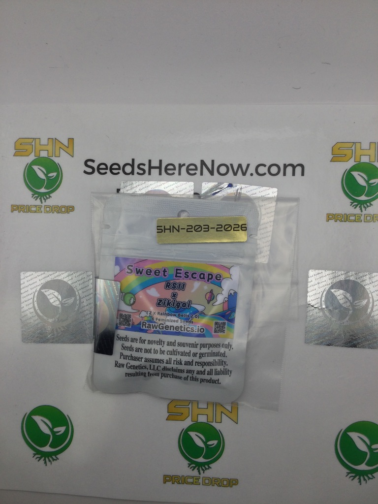 Sweet Escape by Raw Genetics crosses RS11 with Zikigal. RS11 (Rainbow Sherbet #11) is a top-shelf hybrid from Deo Farms that took the cannabis world by storm with its sweet sherbet candy flavor and vibrant colors. Zikigal adds exotic terpene complexity. Sweet Escape lives up to its name with an escape into sweet, colorful, euphoric bliss.